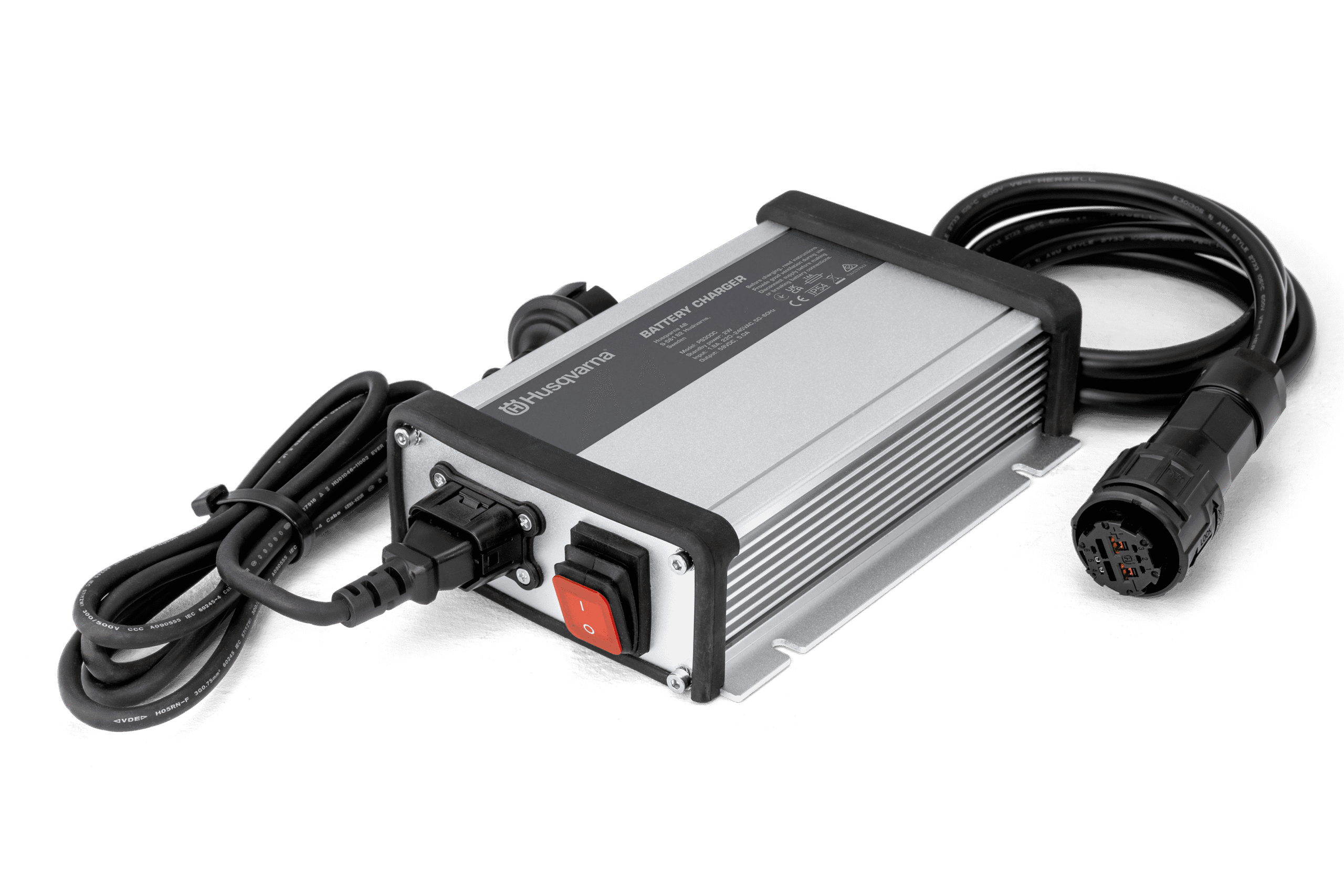 PS300C är en 300W strömkälla för laddning av 48V Li-ion batterier för åkgräsklippare. Den ansluts till produkten med en enkel klickanslutning och kan väggmonteras för smidig åtkomst.