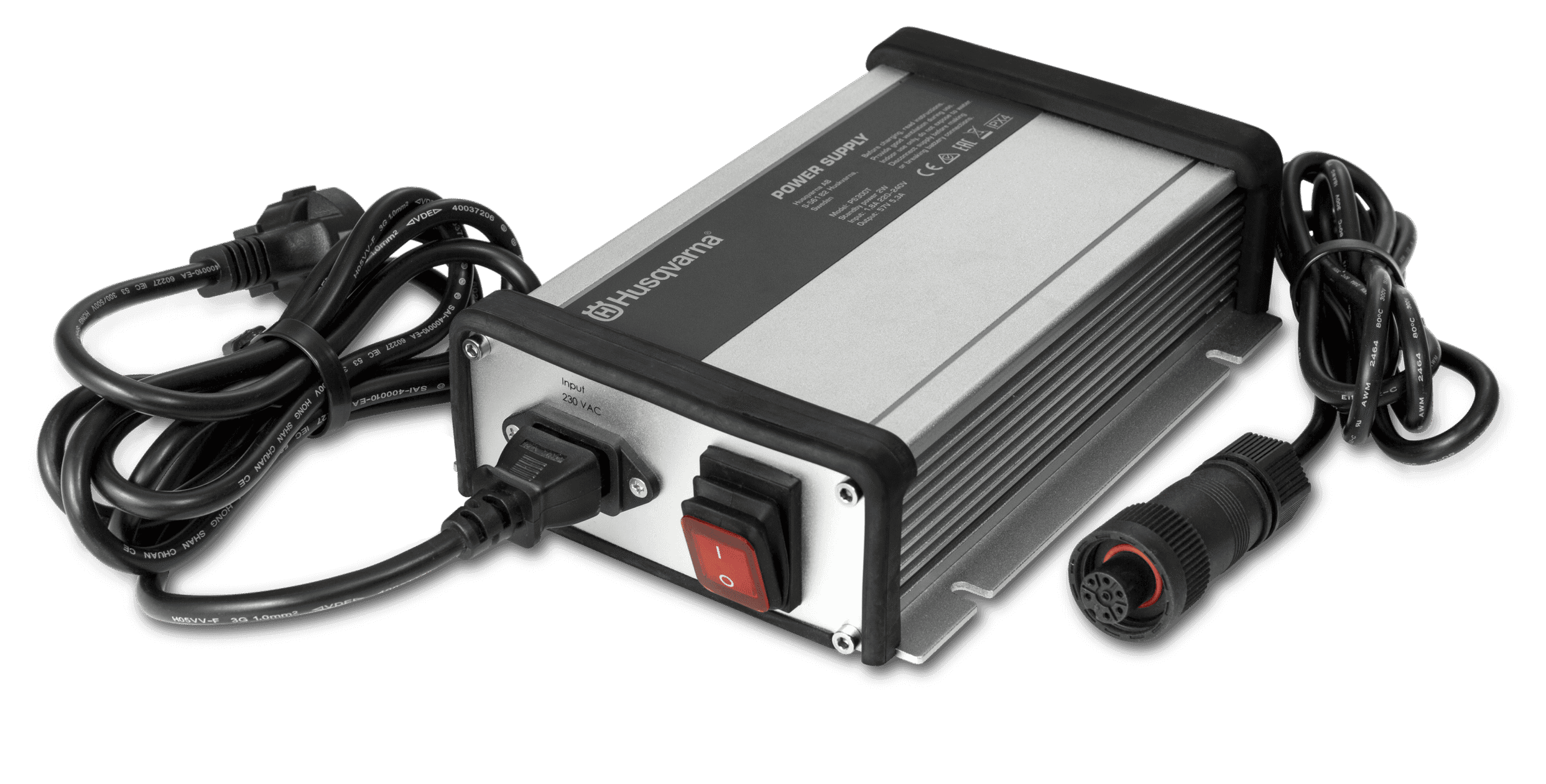 PS300T är en 300W batteriladdare för laddning av 48V Li-ion batterier för åkgräsklippare. Den ansluts till produkten med en gänganslutning och kan monteras på väggen för smidig åtkomst.